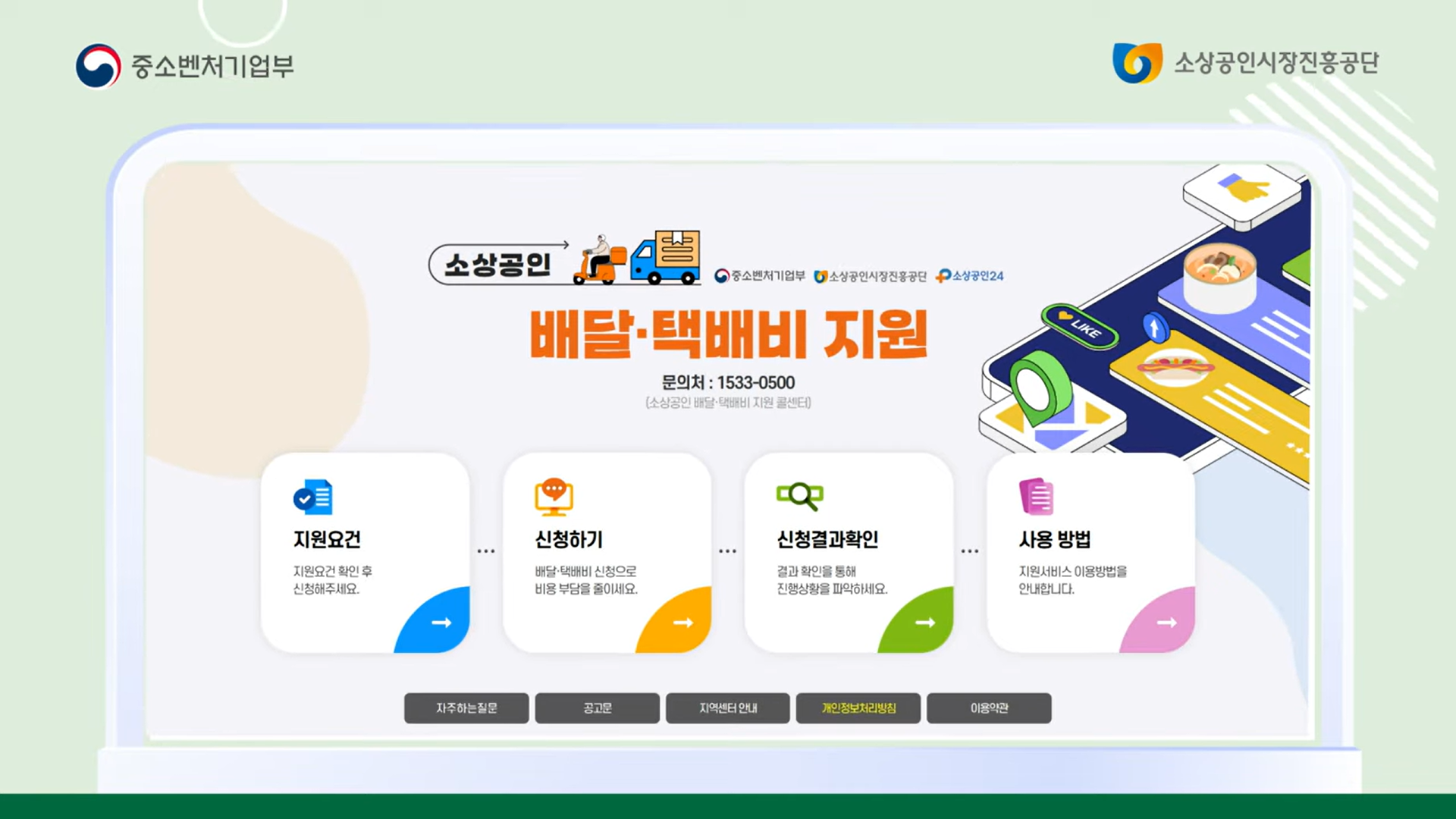 - 소상공인 배달·택배비 지원 콜센터: 1533-0500 (평일 09:00~18:00)